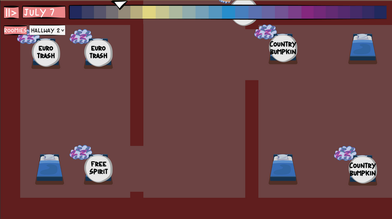 Summer in San Francisco is a fish-tank simulation with fully working character customization, and dynamically generated, randomized NPCs--basically you watch a bunch of degenerates in a house do nothing but eat, sleep, watch TV, chat, and smoke. NPCs daily behaviors, hobbies, and friends are entirely stat driven; complete with randomized names and hometowns, no single playthrough is exactly the same!